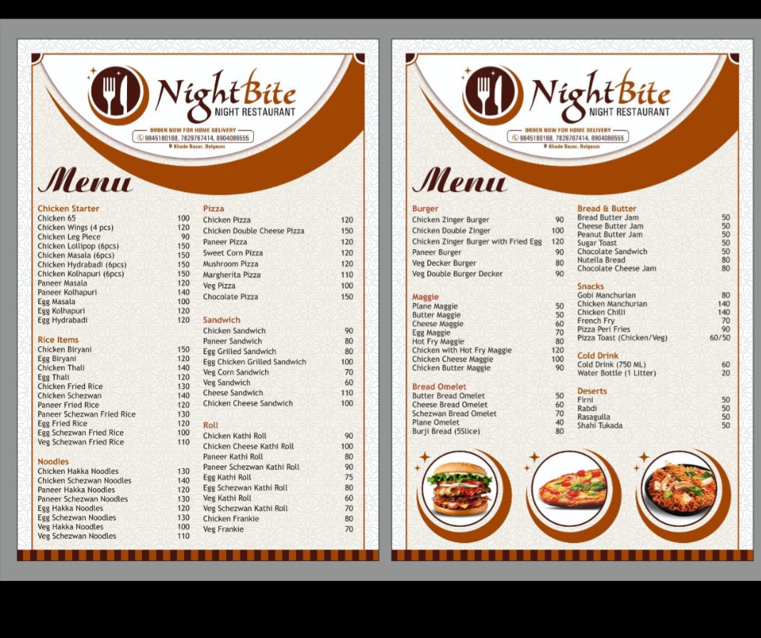 Welcome to Night Bite, a delightful café nestled in the bustling Khade Bazar of Belagavi, Karnataka. Specializing in late-night cravings, Night Bite offers an extensive menu that caters to all tastes. From an array of sandwiches, including Chicken, Paneer, and Cheese options, to vibrant Kathi Rolls, the choices are both varied and enticing.